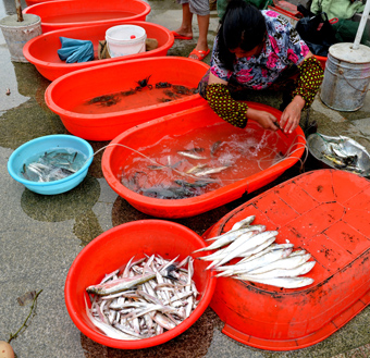 新鲜的鱼货从江中捕捞而来,各个品种数量很少。
