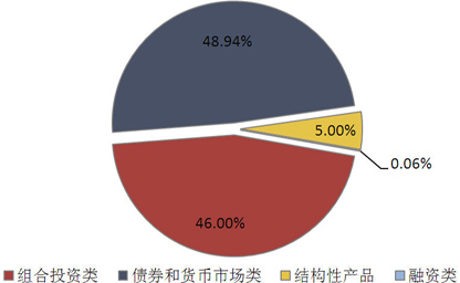 从投向类型来看,债券与货币市场类产品发行2400款,环比减少32款,市场占比上升0.18个百分点;组合投资类产品发行2256款,环比减少21款,市场占比上升0.35个百分点;融资类产品发行3款,环比减少9款,市场占比下降0.18个百分点;结构性产品发行245款,环比减少8款,市场占比下降0.08个百分点。(图4)