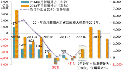 金融:9月外汇占款余额由上月的减少311亿元,重新转为正增长,但增幅较小,仅为11亿元。据此推算,跨境资金净流出规模约2448亿元。自5月来,外汇占款增量呈明显双向波动态势,且跨境资金净流出规模始终保持在2000亿元上方。上月美联储正式宣布结束QE政策,如资金趋势性回流美国,将对我国外占增长和流动性带来冲击。但考虑美国经济尚处温和复苏,加息料不会早于明年年中,且QE退出经历了渐进过程,市场已充分适应,剧烈波动重现应不大可能。因此,本次美元趋势性走强的影响,在国际流动性宽裕的环境下,或更多反映在大宗商品价格疲软和对国内的通缩输入方面,而资金流动上的冲击则还要取决于中国自身基本面,若国内经济能够保持平稳增长,相信国际资本流动对中国外占增长的作用将较为有限。(图1