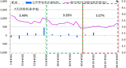 综合上述因素,我们认为,考虑到降低社会融资成本仍是政策的重要目标,适度宽松措施仍将择时推出,而且SLFMLF以及财政存款的投放为资金面打下宽松的基础,因此预计11月资金面将偏松,7天回购利率中枢在2.80%-3.10%