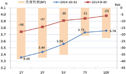 10月份资金面整体较9月份宽松,7天回购利率月度中枢为3.07%,较9月下降19bps10月上旬,受月中缴税因素影响,7天回购利率缓慢震荡上升。1014日,央行再次下调14天正回购利率10bps3.4%,且市场传闻央行对股份制银行进行规模约3000亿MLF(中期借贷便利)操作,令市场宽松预期急剧升温,7天回购利率一路走低,在21日触及月度低点2.95%。月末,由于新股申购较为密集,资金面趋紧,7天回购利率小幅震荡走升。(图2