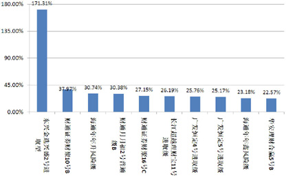 从表现最好的产品收益情况看,排名前十的产品债券型6款,混合型4款,除“东兴金选兴盛2号进取型”外,其他收益都在40.00%以下。(图10)