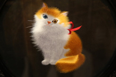 姚芳勤的刺绣作品中,以绣猫见长,她的双面绣猫,不仅猫眼栩栩如生,而且猫的毛一根根清晰可辨。我在芳勤绣坊见到了一幅姚芳勤的作品《猫鱼图》,只见黄色的虎斑猫,眼睛盯着一边的金鱼,活灵活现。姚芳勤说:这幅作品,绣了整整一个月多。