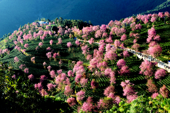 2014127日,24节气大雪节令,云南大理州南涧县无量山镇蛇腰箐华庆茶厂的千亩茶园里,上千株冬樱树樱花在绽放。张良/ 图文