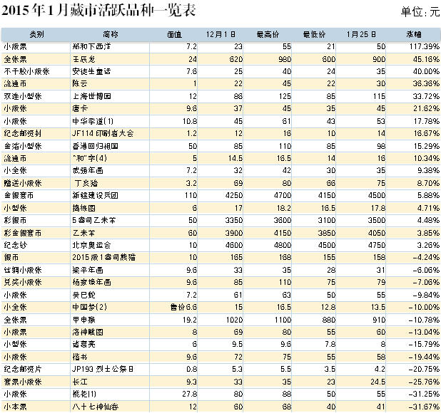 2014年第四季度在市场上炙手可热的品种温度开始下降,随着文交所的走势变化,这些已经挂牌上市或没有如愿上市的品种均纷纷走出回调表现。如双连小型张板块中的无锡亚展洛阳世展十八大均分别回落到73元、100元和55元,悉尼奥运会邮联六大邮联七大、和改革开放双连小型张也分别下沉至175元、51元、34元和76元,惟上海世博园双连小型张受到托管消息影响而逆势走强,1月下旬创出128元新高。而人大50晋祠彩塑小版张分别下挫到130元和230元,司马光砸缸古代书院(2辛亥革命小版张则分别滑落至85元、30元和28元,八十七神仙卷小本票回调到40元左右。此外,纪念邮资片中的不少品种价格下跌,整包货源的最低价位重新跌破3000元整数关。