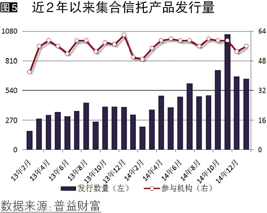 本月共有56家信托公司发行了649款集合信托产品,发行数量环比减少22款,降幅为3.28%。这个降幅较小,远远小于2014年春节前一个月的降幅(17.90%),这表明虽然业界人士在抱怨业务难做,但市场依然存在较多机会。