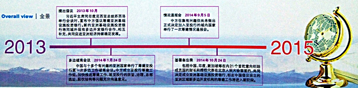 2014124日,中国与十多个有兴趣的亚洲国家举行了筹建亚投行第一次多边工作磋商会议,就筹建亚投行的框架方案交换了意见,中方还成立了亚投行筹建工作组。同年1024日,包括中国、印度、新加坡等在内的21个首批意向创始成员国的财长和授权代表在北京正式签署《筹建亚投行备忘录》,共同决定成立亚投行,标志亚投行的筹建工作进入新阶段。