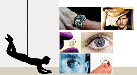 在《碟中谍》系列里给人留下深刻印象的就要数这个内置芯片的隐形眼镜了。它的功能自然不是帮助特工提升视力,而是能够通过它内置的芯片,将特工所看到的信息进行传递。这个设备在电影中第一次出现时,特工通过与信息中心联网获取了目标任务的相貌特征,然后启动隐形眼镜的面部识别功能,从而锁定了目标人物,并完成了文件的截获;第二次发挥作用则是它的面部识别功能识别出了迎面而来的职业杀手,并向特工的手机发送了警报,只可惜时间已晚;而第三次真正用到它,则是在伊森小组成为幽灵成员之后,没有了信息中心的联网,面部识别功能已经失效,然而小组通过将它与藏在文件箱中的打印机相连,使这个隐形眼镜有了照相机的功能:连眨两下眼,拍照。