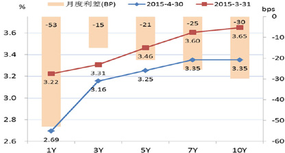 35月份仍有降息或降准机会。一是新近公布的3CPI1.4%,与上月持平,通胀整体维持低位,叠加国际油价下跌带来的输入性通缩影响,货币宽松有较大的宽松空间。二是近期美国公布的经济数据喜忧参半,3月非农数据大幅逊于预期,令市场对美联储加息前景产生疑虑,人民币贬值压力减弱,有益于货币宽松政策推出。三是李克强4月在东北地区视察时发表讲话称,中国经济正面临着越来越大的下行压力,经济改善亦需要货币宽松的支持。同时,今年3月金融机构口径外汇占款减少1564.76亿元,下降幅度为2007年以来最大,外汇占款大幅负增长也很有可能使央行再次降准。