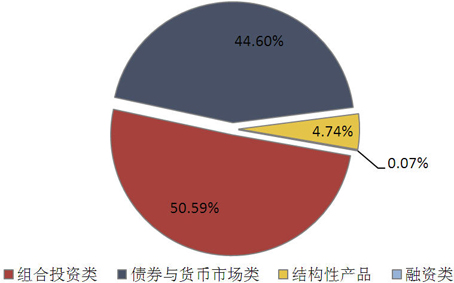 从投向类型来看,债券与货币市场类产品发行了2598款,环比增加183款,市场占比下降2.95个百分点至44.60%;组合投资类产品发行了2947款,环比增加499款,市场占比上升2.39个百分点至50.59%;结构性产品发行了276款,环比增加60款,市场占比上升0.49个百分点至4.74%;融资类产品发行了4款,环比增加4款,市场占比上升0.07个百分点至0.07%。(图4)