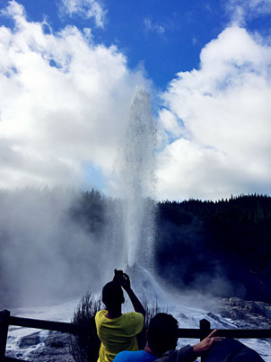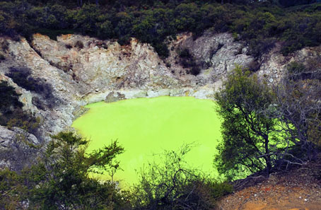 “WAI-O-TAPU”在毛利语中有“圣水”的意思。这个被称为大自然调色盘的地热公园,是由早期火山喷发所形成的岩浆地热。其中最著名的是每天早上10点15分Lady Knox Geyser间歇喷泉,喷出的水柱高20-30米。这可不是普通的喷泉,是地热直接喷发出带着浓厚的硫磺气味的喷泉。解说在10点时准时出现在喷泉旁,先是有人往里面倒了点东西,应该就是这喷泉的引子,几秒钟后喷泉开始跃跃欲试,解说也迅雷不及掩耳之势的跑开了,一点点、一点点,水柱越来越高,直到形成烟雾缭绕般,仰起头,水柱已升至大概有30米左右的高空了。