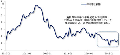伴随国内经济持续疲弱,居民消费价格涨幅结束2012-2013年的小幅震荡上行周期,自2014年二季度起持续下行,进入2015年则呈低位运行态势。今年上半年,CPI月同比涨幅均值1.3%,去年同期为2.2%,同期涨幅系全球金融危机后最低。