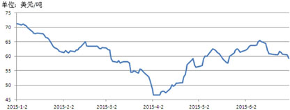 国际铁矿石价格指数TSI①开于71.2美元/吨,收于59.3美元/吨,较年初的开盘价下跌了16.7%,上半年最低价为4月2日和6日的46.7美元/吨,最高价为1月2日的71.2美元/吨。(图6)