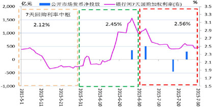 展望后市,8月对资金面不利因素主要有:一是外汇占款可能继续减少。今年以来,外汇占款的波动较大,有3个月的外汇占款减少,3个月的外汇占款增加,总体来看,增加的幅度在300-400亿左右,减少的幅度多在900-1500亿左右,其中6月金融机构新增外汇占款减少937亿元。随着中国股市的大幅波动,预计7-8月的新增外汇占款仍将呈减少态势,外部流动性相对不足。二是例行的缴税因素。三是证金公司的股市护盘仍需新的增量资金不断投入,这将抽取部分市场流动性。