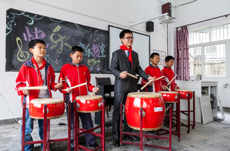 在一间挂有快乐音乐教室铭牌的房间里,学生们在来自上海的志愿者辅导下,调试好乐器,摆放好乐谱,准备开始演奏民乐《农家乐》。很快,悠扬的乐声飞出教室,飞向辽阔的蓝天白云间。