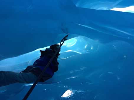 新西兰有大小3100个冰川,海洋性冰川,海拔高度比较低,旅行者很容易到达。它们是千百万年前形成的,也都是缓慢移动的,所以也叫冰河。冰洞里的那一抹幽幽的蓝色,晶莹剔透,有些地方仍在缓缓流淌,如珠帘般落下,在这里,可以找到一切关于蓝的最美的形容词。