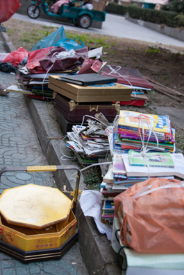 聊起收废品,她跟我介绍,选择这份工作还是选了又选。当年到泰州,做过小工,可没有休息时间;贩过水果,但城管风险太大,而且整天在外,孩子没人带。后来,看到人家收废品,一杆称,一辆三轮车,走走街坊,就有钱挣,关键可以有时间照顾孩子上学,也就做了起来。一开始,也挣不到什么钱,行行都有生意经。这收废品,最麻烦的是分捡整理,卖家把一堆东西指给你,搬运、分捡、打包、称重、装车,全靠你一个人。挣几个钱,也正是分捡的成果。比如,一般的硬质塑料不值钱,要软的。旧报纸和旧杂志的钱也不一样。最好收的是单位的包装箱、盒子,每次都能收不少,好的时候一天能收300多斤,在现场分捡打包好,直接就可以送到打包站。说到这儿,她还向我透露点小秘密:废报纸、包装箱等不要送到大收废品站,他们价格低,而一些品种单一的打包站会厚道些,总会每斤多给35分的。打包站呢,会在她们送来的废品上洒些水后,再用机器压缩成块后卖给造纸厂,多赚些重量钱。如今这一行做时间长了,挣钱的路子就开阔许多,不仅有固定家庭客户,还有企业单位,都是手机预约,更少了些风里来雨里去的。