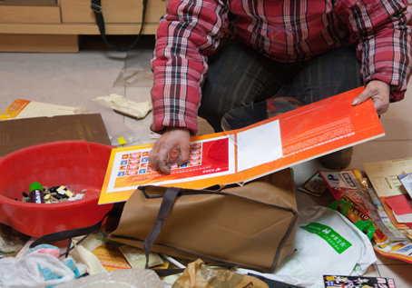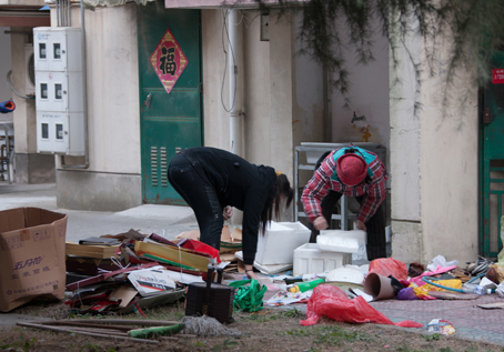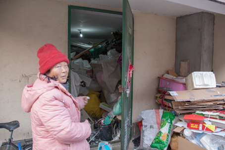 她家住一楼,楼下还有个自行车库。在楼前、后并没有看到多少废品,少些放在车库前的也收拾得整整齐齐,并没有想象中的脏乱。原来她总是第一时间就把能卖的卖掉,尽量不让东西积压在小区里,影响到邻居。而来不及整理的废品全部被她挤进了十几平方的车库里。她说,丈夫在以色列做木工时,伤了腰,她生病后,也不能干重活,所以太多的分拣,就只能请人来帮忙,虽然还要花些钱,不过总是有钱赚的。