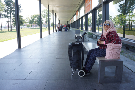 柏林机场不远处就是火车站,因没有零钱在售票机上买票,又没有人工售票,翻译只得返回航站楼换零钱。红眼儿飞行的疲惫,让我很羡慕这位老兄,拍完这张照片,我就躺在了他的不远处。我俩可能都来自文明程度不如德国的远方,他能先在这儿睡上一觉,我却要按规程行走,就此,是不是他内心的自由度要比我好一些呢?自由,自然离不了环境的给予,但心灵的自由,是可以超越环境的。超越的程度,在于我。望着在北京不多见的蓝天,我想我的旅行箱虽然比他的新一点,但心灵的破旧很可能比他严重。人老了,才容易不在乎外物而更多地观照内心,才懂得内心的舒适、喜乐原本是可以超时空的。十几天后回国时,我还会经历红眼儿飞行的折磨,不知道那时的我能不能在首都机场前的草坪上也先睡上一觉。走廊里的游客不断,但快乐的表情不多。痛苦与快乐,这是人类思考了几千年的问题,但现实生活的快乐度却没有多大的改变,我同样没有快乐德国游的期望,能够谋得一些新鲜的体验就够了。