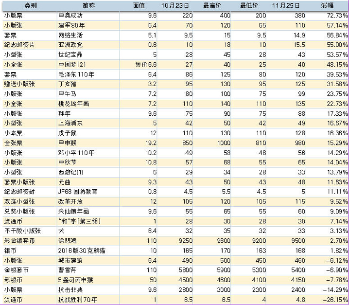 11月份套票的收购阵容明显扩大,粗略统计已超过了200多种,其中三分之一是需求大批量的求购,具有后期托管上市的征兆,而所波及的品种主要以近10年发行的新邮为主。如2007年发行的扬州园林舞龙舞狮内蒙古孔融让梨重庆建设杨尚昆100套票即分别攀升到4元、4.5元、3元、2.5元、2.4元和4元附近,2008年发行的龟兹石窟壁画海南博鳌苏通大桥千岛湖风光套票则分别走高至4.5元、2.8元、3.5元和3元左右,而2009年发行的古代书院(2杭州湾大桥拉卜楞寺黄龙京杭大运河套票也分别上扬到4元、3元、2.8元、3.5元和6.5元,2010年发行的宋任穷红色娘子军成语典故(2楼兰古城上海世博会文彦博套票分别涨至3元、4.1元、4元、2.3元、4.3元和2.4元。