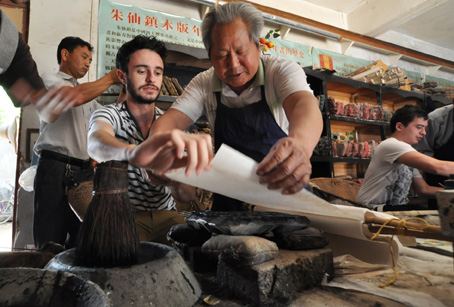 来自英国的留学生到开封市朱仙镇体验木版年画套色印刷工艺   /CFP