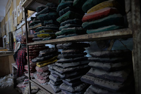 “天成老店的木版年画制作技术极为考究,独具特色,步骤也颇为复杂,仅它的用色染料就多达9种。并且印色全部采用植物原料精心熬制而成,据说里面还添加了一些名贵中药,因而印制出来的木版年画色彩鲜艳,永不褪色,就是把刚印染出来的年画放在水里,也不会洇染,更不会串色。