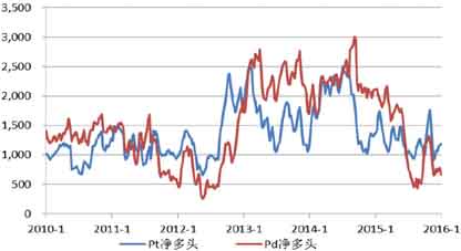 COMEX铂、钯净多头持仓和ETF表现出相似情况,从2014年中开始出现大幅降低,至2015年底已降至五年来最低位附近,并且钯金的降幅较铂金更为剧烈。ETF及COMEX的双重减持对铂钯价格构成巨大压力,使得铂钯在供给出现缺口的情况下依然大幅下跌。(图11)