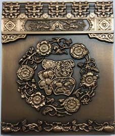背面图案:大门与照壁墙实景设计,图案中同样采用门檐造型,门牌上为五只蝙蝠的吉祥图案,与正面的五福临门大字相互呼应。大门中间采用传统砖雕照壁,照壁上为美化的字图案。
