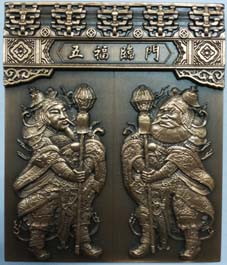 这枚造型独特的大铜章正面图案:整体采用我国古代宅院大门实景设计,图案中有中国传统建筑的门檐造型,门牌上书写五福临门四个大字,门板上为中国传统年画中的一对门神。
