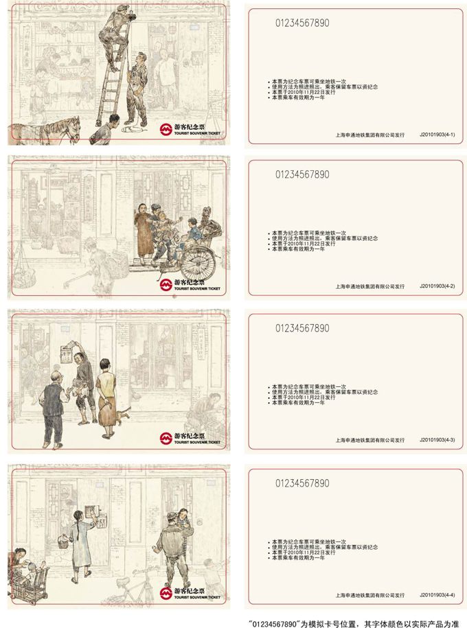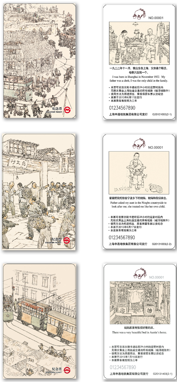 表现贺老绘画作品的地铁卡,创新多多,以“走街穿巷忆旧事”为例:地铁卡正面为贺友直反映相关主题的画作,地铁卡反面则是贺友直以绘画形式所作的简洁自传。两枚卡还配有一本薄薄的口袋书,总共54枚卡,中英文对照,内容非常丰富,既有指示图,也有绘画,更有版本较新的上海地铁线路图。新型地铁纪念书、卡结合,集读视听行于一体,象征一个新的文化传播时代就此开启,给丰富的上海地铁文化增添亮丽的一笔。