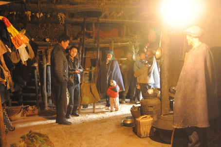 到了一片稍微平整些的地方,但见满地大坨大坨的牛粪,一堵堵歪歪斜斜裂着大缝、长着荒草的矮土墙围着只露着黑瓦的房顶。有三三两两村民裹着深色的斗篷蹲在墙角,雕塑般一动不动,几个小孩子在地上滚来爬去,一身的泥污。见村长过来,有村民热情地招呼。走进一户农家的大门,说是大门其实就是一个不弯腰会碰头的门洞,所谓的门也只是用参差不齐的几块木板拼成的一块大挡板,朽得已经看不出木头的质地和成色。