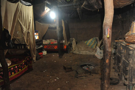 院子里随意堆放着杂物。矮矮的土房四壁到处是裂缝,似乎随时都会塌下来。弓身钻进房间,一股牛粪味混着潮霉味扑面而来。打开灯,昏黄的灯光下,只见一面放着床铺,一面立着箱柜,一面堆着粮草,一面圈着黄牛,而在房屋中间的位置则是一个火坑,上面有口锅在冒着热气。主人说是在煮猪食。