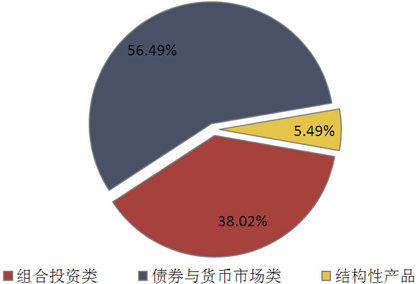 从投向类型来看,债券与货币市场类产品发行了4106款,环比减少233款,市场占比下降1.30个百分点至56.49%;组合投资类产品发行了2763款,环比增加13款,市场占比上升1.39个百分点至38.02%;结构性产品发行了399款,环比减少20款,市场占比下降0.09个百分点至5.49%;融资类产品仍然没有发行。(图4