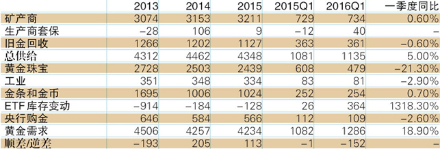 1 全球黄金供需情况(单位:吨)