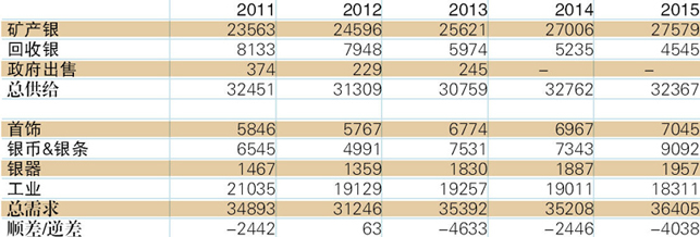 2015年全球白银供给缺口上涨65.2%4,038吨,其中供给增长2.1%,需求增长3.4%。(表2