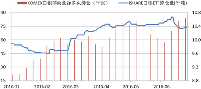 2016年上半年,CFTC白银非商业净多头大幅上涨,截至628日当周净多头持仓达83,661张,是去年底的3.04倍。1-2月快速上涨,3-6月震荡攀升,基本与白银的走势行情一致,显示白银行情与投机资金流向联系密切,相对而言,ETF持仓变动与白银价格的关联性要弱一些。(图6