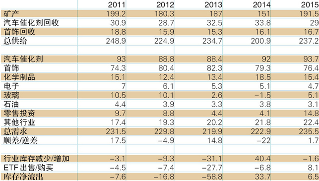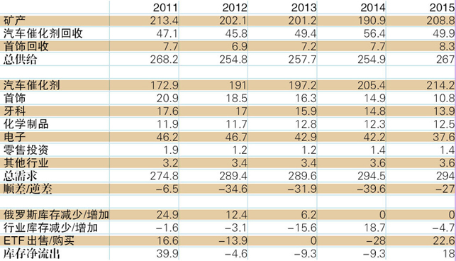 需求方面,2015年铂金需求增长5.7%235.5吨,主要来源于零售投资需求的增长(10.7吨),几乎全部来自日本。扣除零售投资,主要工业行业需求基本平稳,略有增长。2015年钯金需求基本平稳,略有减少,催化剂需求增长8.8吨,电子行业需求下降4.6吨,首饰需求下降4.1吨。(表3