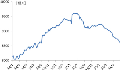 本轮油价暴跌中,美国油井钻机数急速滑坡,从2015年年初的1482台,下降至20165月底的316台,降幅78.68%。随着油价上升,从6月开始,钻机数开始小幅回升,从316台上升到71日当周的341台。钻机数量下滑,使页岩油井的高递减率无法像过去几年一样被弥补,导致美国原油产量增长停滞,从去年6月触及961万桶/日的周均产量顶点逐渐回落至862.2万桶/日,相距高点回落10.3%,产能出清效果初显。(图2