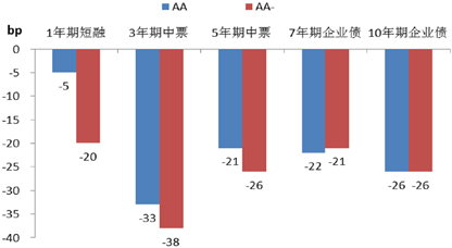 二是中长期限表现优于短期限。随着信用债收益率的不断降低,市场出于对收益率的追求,增加了中长期信用债的配置,期限利差持续收窄。除AAA3年期、5年期中票有所拓宽外,其余等级债券期限利差均有所收窄。(图4