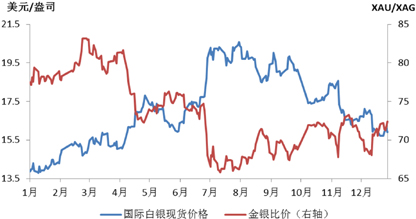 白银价格驱动因素与黄金相同,主要受宏观因素影响。四季度,白银受有色金属上涨带动,且供需基本面略好,走势整体强于黄金。金银比价年内大幅下降:一季度,白银走势较弱,金银比价一度超过83,创下五年高位;二季度,金银相对强弱逆转,白银震荡盘升表现强于黄金,金银比价经两轮下跌修复,至70下方;下半年,加息因素叠加特朗普当选冲击,受有色金属上涨带动及供需基本面强于黄金的影响,白银走势仍强于黄金,金银比价年末收于72.41,较年初下降6.5%。