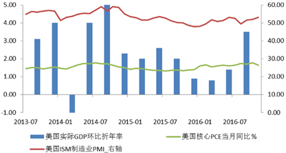 受内外部不稳定因素影响,美联储明显放缓加息节奏。2015年12月启动加息时,暗示2016年加息4次。但受上半年经济表现较弱,以及英国脱欧、美国大选等事件影响,联储仅在年底加息了一次。12月,再次宣布加息25个基点时,公布的利率预测显示,2017年预计加息三次。但从会议纪要看,特朗普当选后的财政政策预期及其通胀效应,使未来加息节奏依然不确定。我们认为,实际经济表现将是决定加息速度的关键因素,需更多关注特朗普上台后,财政政策落地、美国通胀水平上升速度等情况。