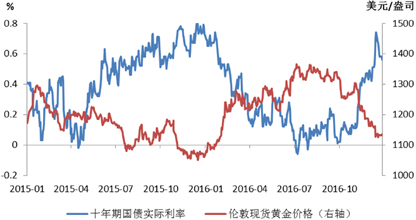 美债实际利率已成为观察短期金价走势的优良参照,2016年十年期美国国债实际利率与金价的负相关关系已达到91.10%,较2015年的78.51%负相关性大幅上升。