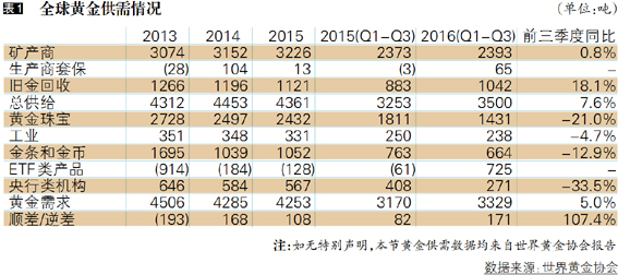 2016年前三季度,受ETF投资大幅增长影响,黄金需求大幅增长,总量3,329吨,同比增长5.0%。但受金价上涨影响,除ETF外的各项需求同比普遍下降。供给同比增长7.6%,主要源于金价上涨刺激回收金供应,以及生产商套保卖出量增长。据世界黄金协会报告,企业新项目开发停滞限制了供给增长的规模,未来矿产商产量将继续保持平稳。供给变动将更多受回收金供应影响。