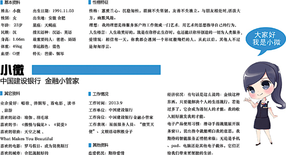 如果有人认为智能机器人是冰冷、没有温度的,那他一定还不认识建行小微。通过调查研究用户偏好,小微有了人生中第一份档案,她是个温婉智慧、多才多艺的90后天蝎座女生,同时也是充满活力与亲和力的“银行从业者”。 她最大的愿望是广交朋友,不断努力,让小微深入人心。