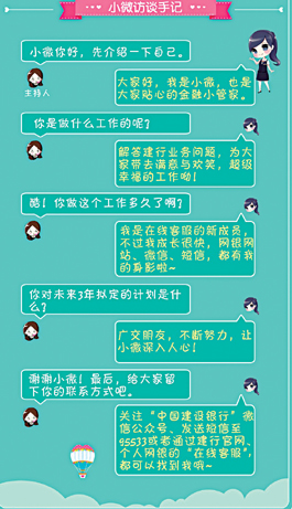 2013年11月,“小微”首次通过“中国建设银行”微信公众号亮相,一经推出,便以7*24小时、无需等待的便捷体验、活泼可爱的形象和智慧风趣的语言风格,赢得广大用户的喜爱。现在,无论是通过互联网网站、网上银行,还是建行微信公众平台、95533短信、手机银行客户端等移动金融服务平台,都可以享受到小微提供的建行业务问题咨询与聊天应答服务。