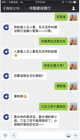 小微虽然是个学霸,可以快速解决业务问题,但她并不高冷,可以时时陪在身边谈心聊天。通过对用户会话习惯、会话内容的分析提炼,建设银行建立了智能聊天库,涵盖交互场景近3万个,可连续对话超过10轮。从衣食住行,到娱乐八卦,甚至时下流行的《三生三世十里桃花》,小微都能聊上几句。俏皮可爱的形象,幽默风趣的语言风格,会卖萌的小微圈粉无数。