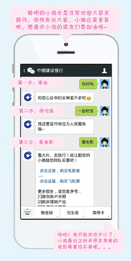 关注并打开“中国建设银行”的官方微信,在输入框里输入或者使用语音陈述您的问题,小微就会给您解答,绑定账户后,您还可以轻松享受查询储蓄账户余额、信用卡账单等服务。如果您的问题小微没有回答上来,您可以换个方式提问,或者选择咨询“小微的老师”。