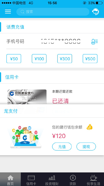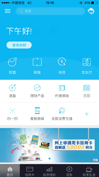 首页、信用卡、投资理财、贷款、悦享生活五大主导航菜单,将用户关注的服务功能通过小图标菜单的形式部署于各个导航菜单第一屏,入口前移,访问流程简化,用户两步内就能到达所需页面。
