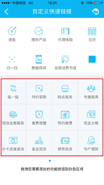 新版手机银行为用户提供定制个性化菜单功能,用户在客户端首页、投资理财频道首页均可以定制自己需要的菜单功能。同时,首页提供龙支付、快速转账、话费充值、外汇买卖等常用应用,用户可以根据自己需要添加常用应用并通过拖拽的方式自定义栏目展示次序。
