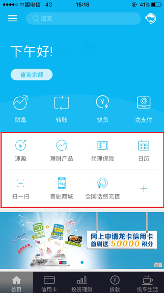 此外,首页楼层“龙支付”、“快速转账”、“话费充值”、“信用卡”、“外汇买卖”等服务模块,用户可通过拖拉的形式自定义模块部署位置,让用户一打开手机银行就能了解到自己感兴趣的内容。